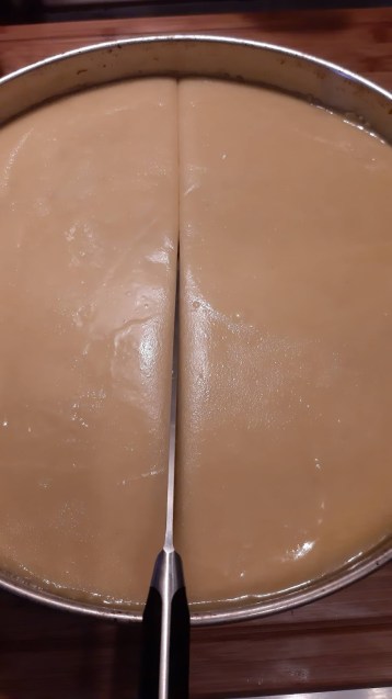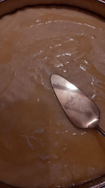 • На така изравнения и загладен сладкиш изсипвам разтопеното масло за украса.
