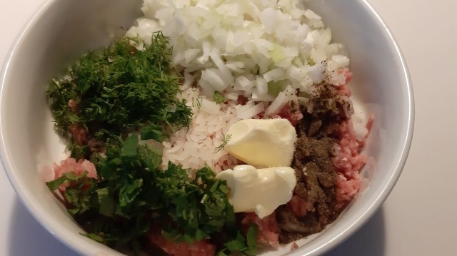 - В дълбока купа смесвам каймата, ситно нарязания кромид лук, ориза, копъра, джоджена, маслото, сол и черен пипер на вкус.