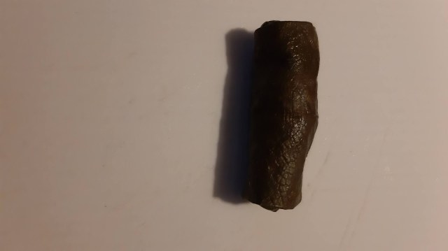 - Сгъвам найлончето върху сармата с двата пръста на дясната ръка притискам леко найлончето над сармата, а с лявата ръка издърпвам найлончето.