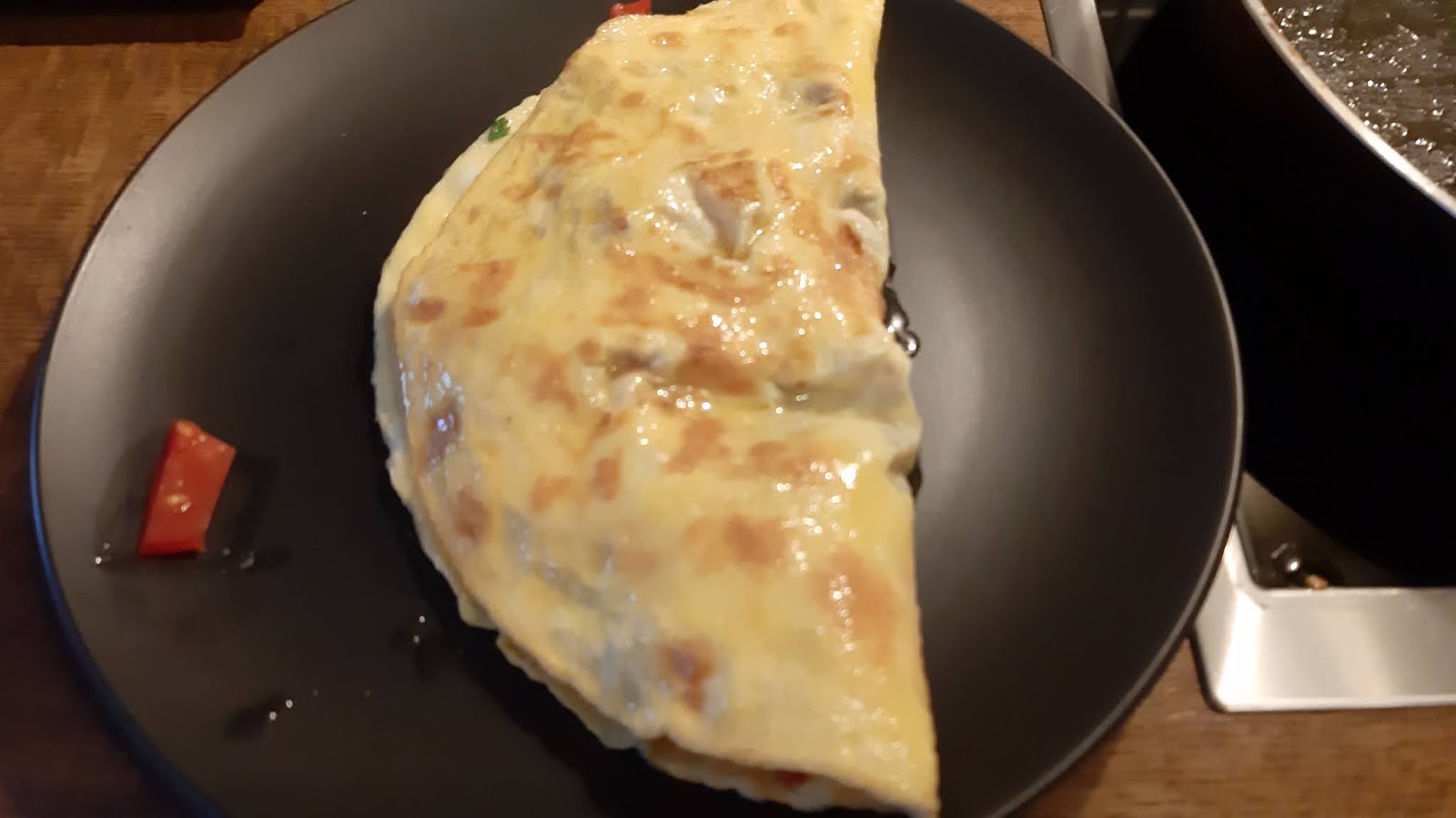 - Когато омлетът се изпече от горе, а това се познава по това, че няма вече течност от яйцата, изсипвам много внимателно в чинията, като втората му половина похлупвам, с помощта на тигана, върху първата по време на изсипването му.