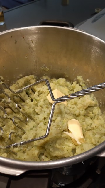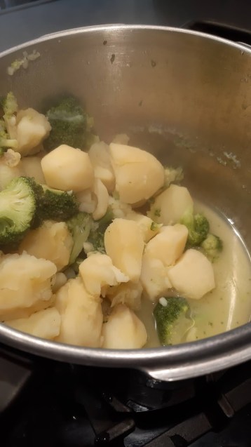 - Обелвам и сварявам нарязаните на едри кубчета картофи за около 10 минути в подсолена вода или бульон.