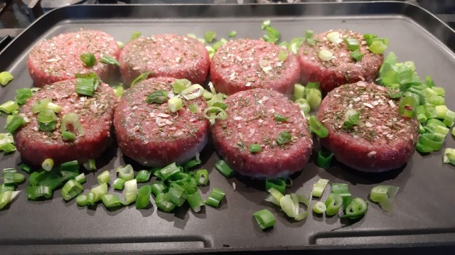 - Около бифтеците добавям зелената част на лука. Ако е нужно и няколко капки олио.