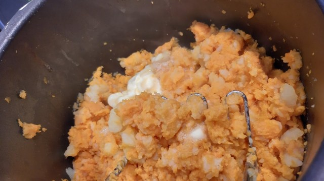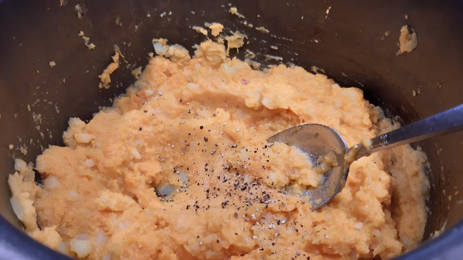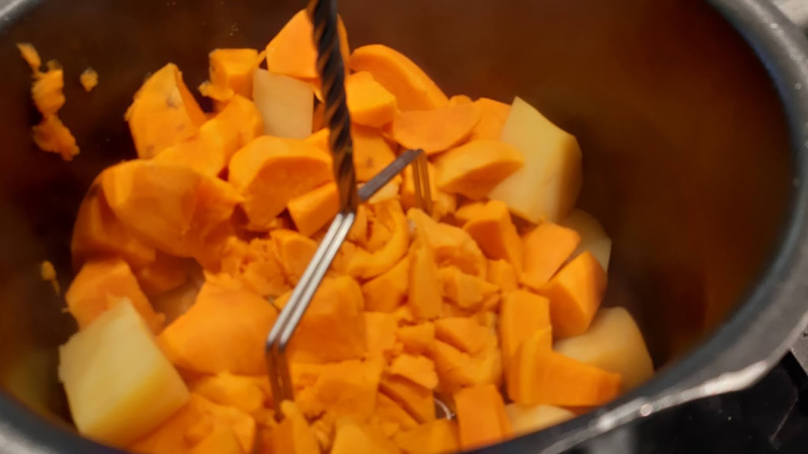 - Обелвам и двата вида картофи, нарязвам на кубчета и сварявам в бульон или подсолена вода до пълна готовност. Може да са нужни около 15 – 20 минути.