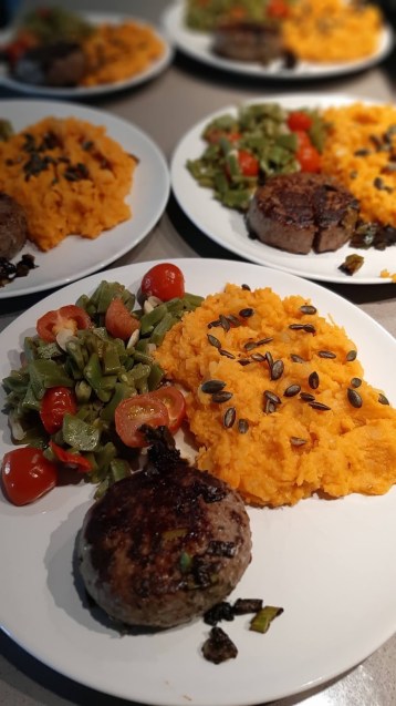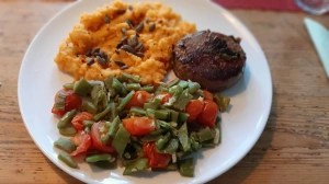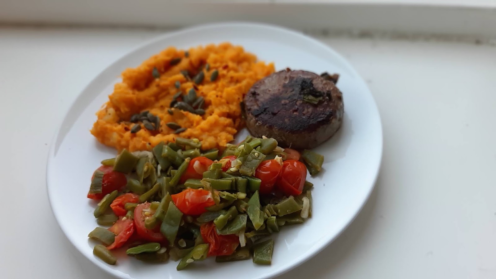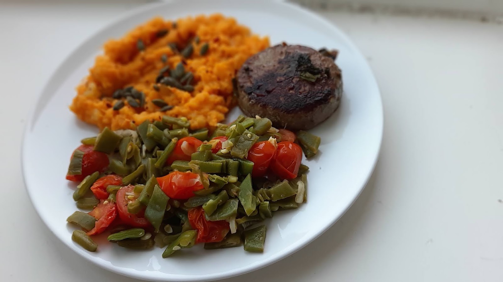 Сервирам в чинии по 1 бифтек, малко картофено пюре и малко от зеления фасул.