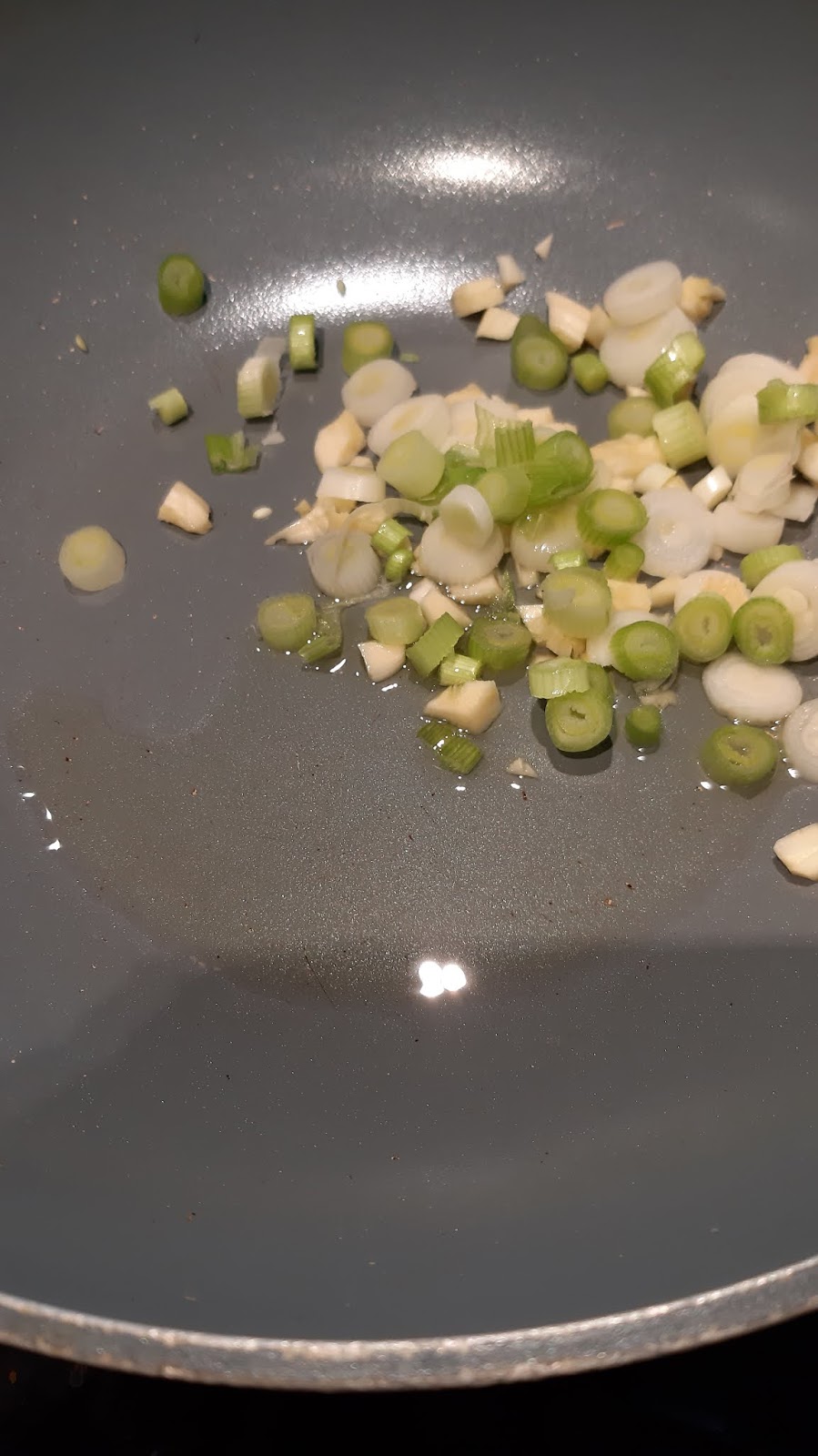 - В тиган загрявам зехтина и много за кратко изпържвам бялата част на лука, и чесъна.