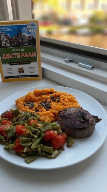 Днешната комбинация в чиниите е типична за Холандия. Интересното е, че тези бифтеци, които се купуват полу готови от магазина, носят името НЕМСКИ БИФТЕК. Може би през втората свтовна война, когато Холандия е била окупирана от Хитлер, немските войници да са ги пренесли. Ама то…и зелените папагали, които тук са навсякъде, ми се струват не на мястото си. Те сигурно са пренесени от някоя холандска колония. За съжаление не успях да ги снимам, но пък снимах как е нормално да си караш лодката и да си купиш пица без да слизаш от нея.