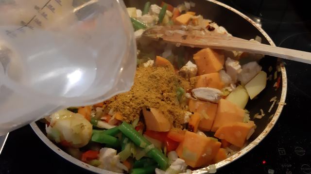 - Намалявам котлона, сипвам суринамската подправка и водата.
