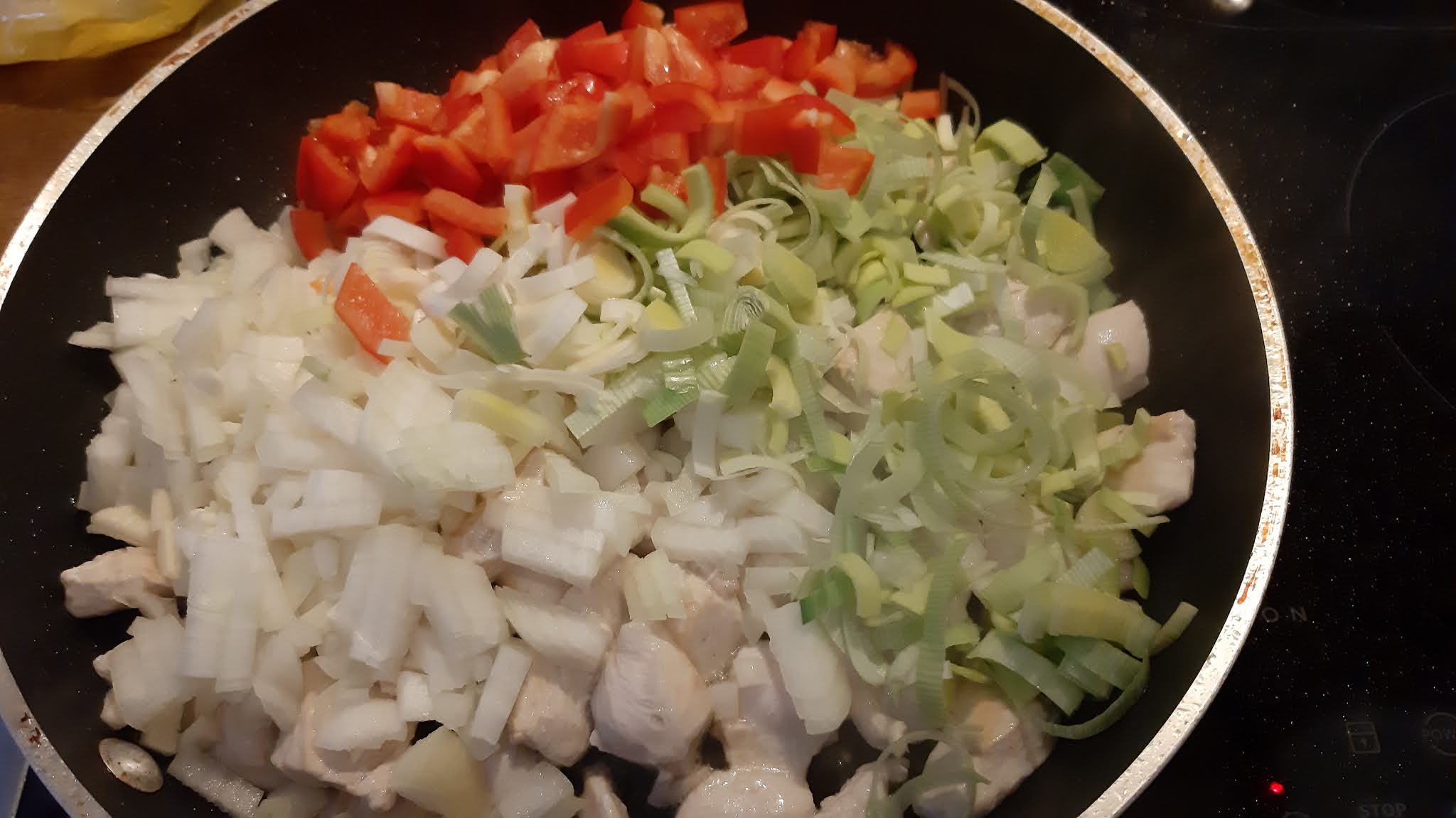 - Добавям нарязаните на кубчета лук, чесън, червена чушка и нарязания на полумесеци праз лук.