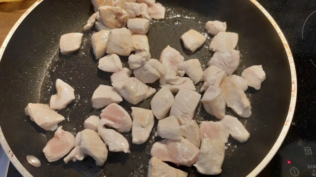 - Загрявам олиото в тигана на максимална мощност на котлона и изпържвам за кратко нарязаното на кубчета пилешко месо.