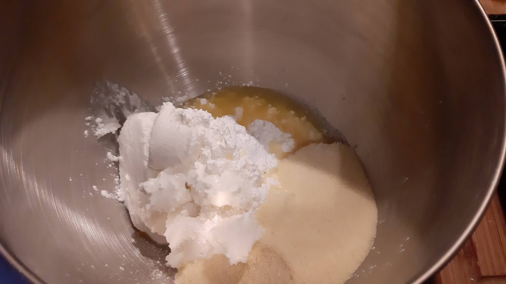 - В купата на миксера смесвам жълтъците, ванилията, изварата, захарта, маслото, солта, нишестето, гриста и бакпулвера.