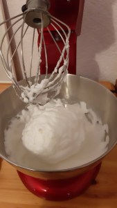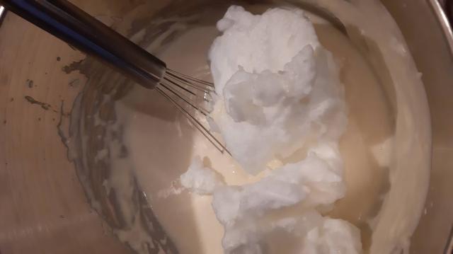 - После добавям малко по малко от разбитите белтъци като разбиването е само с тел. Миксер не използвам.