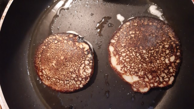 - Сипвам по 2 супени лъжици за една палачинка, като се старая да слагам от тестото само на едно и също място.