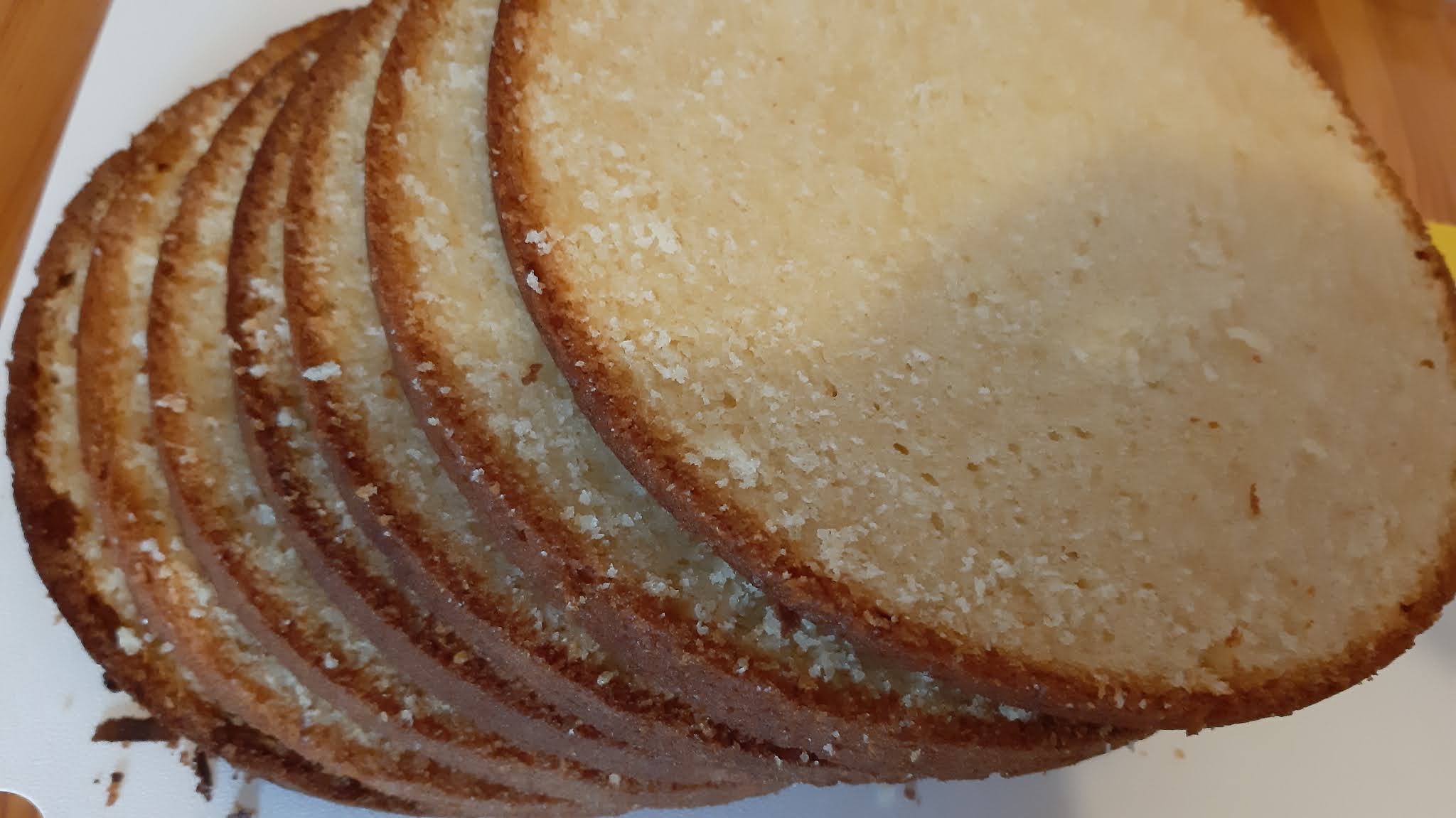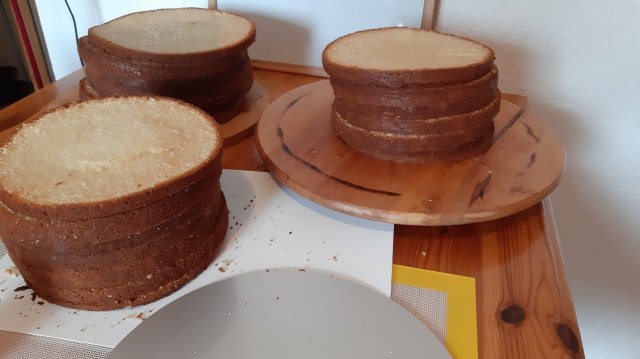 А, за да получа толкова много слоеве, изпичам по-висок от 10 см блат, за да мога да отделя капака и да получа и най-отгоре равен блат.