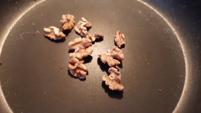 - В същия тиган запичам орехите, но на слаб котлон и докато започнат да пукат. Внимавайте, че много бързо може да изгорят.