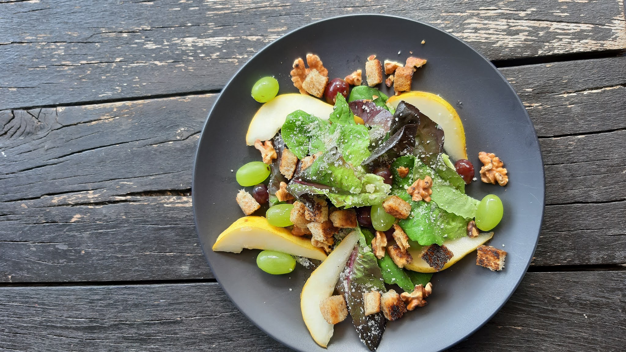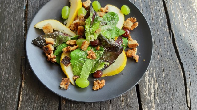- Във всяка чиния подреждам от овкусената салата, гроздето, нарязаните на дълги резенчета круши и почистени от семмките.
