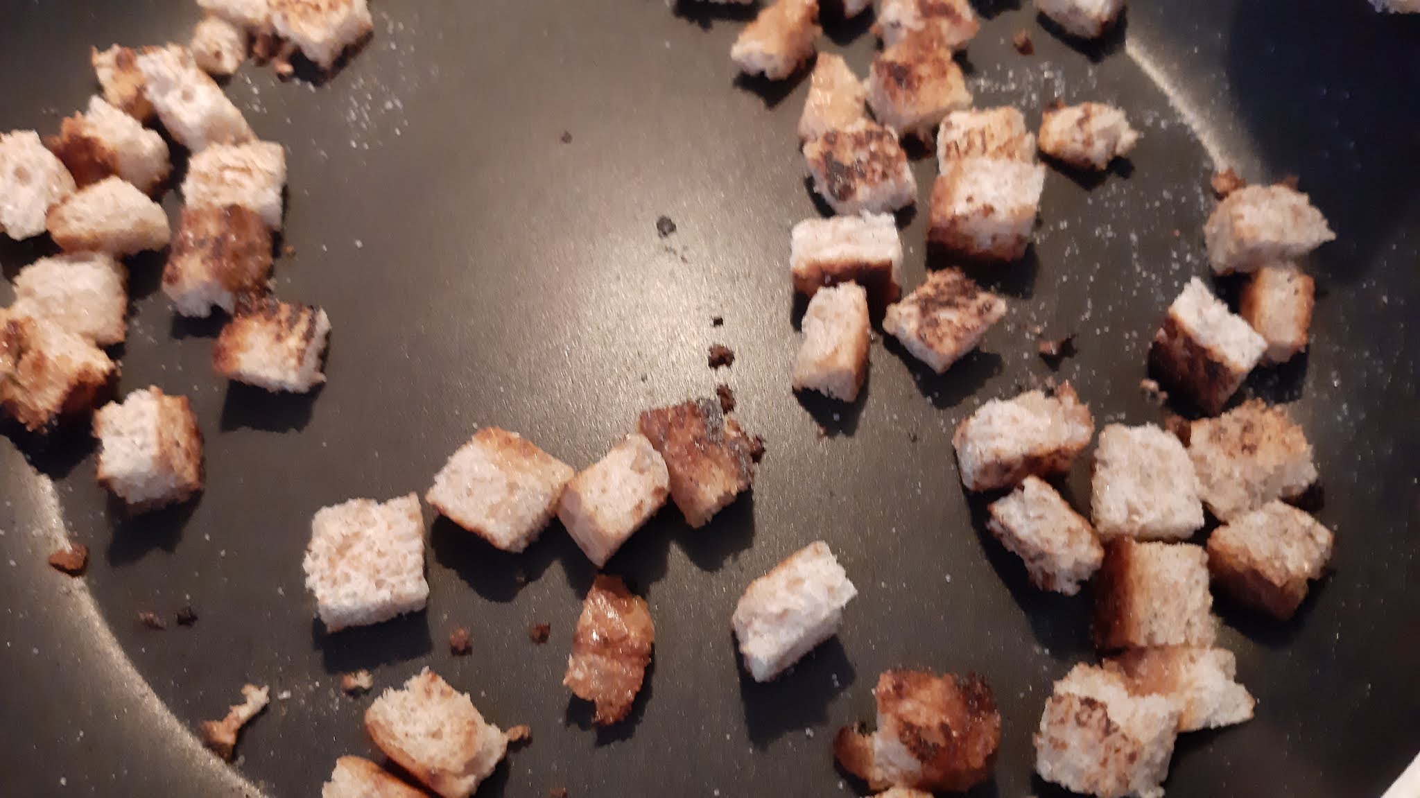 - Загрявам в тиган олиото и изпържвам до хрупкавост, нарязаните на малки кубчета филийки пълнозърнест хляб. Ако не използвате хляб за тостер, е хубаво да изрежете корите. Така крутоните ще са по-вкусни.