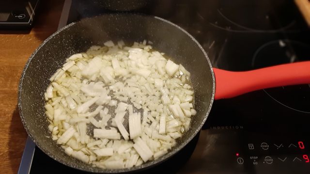 - Загрявам зехтина и изпържвам за 2 – 3 минути нарязания на ситно кромид лук.