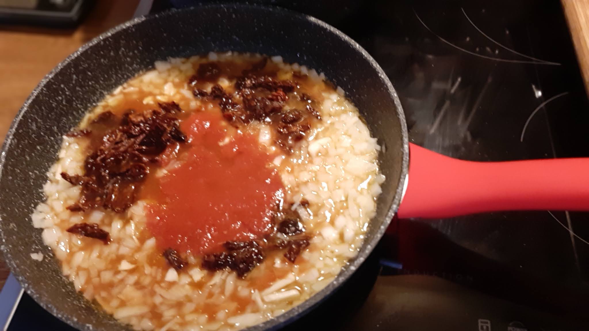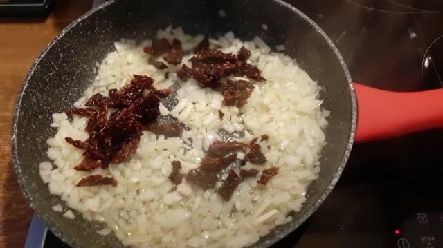 - Добавям нарязания на ситно чесън за около 1 минута и нарязаните на дребно сушени червени домати.