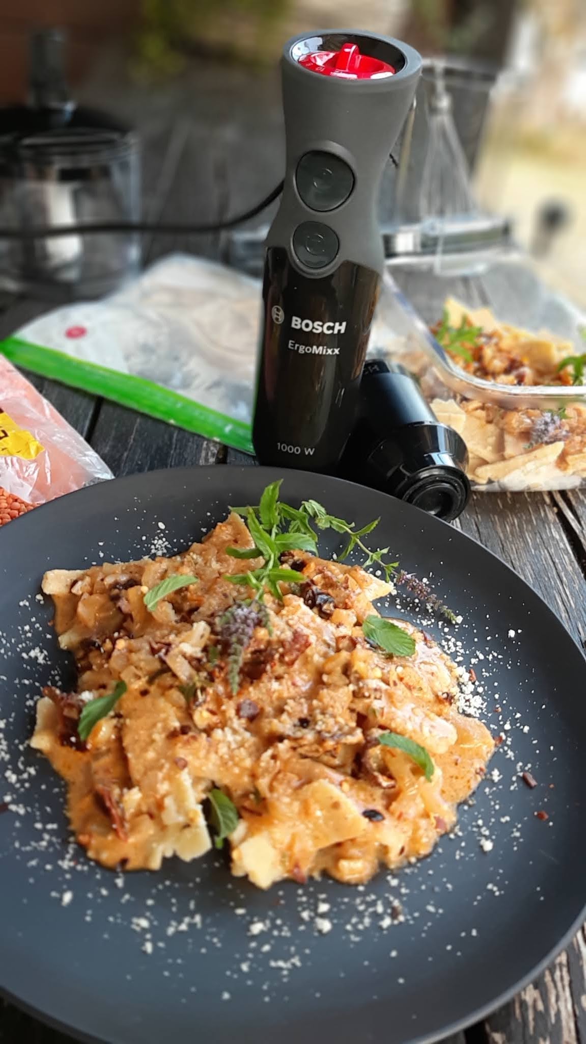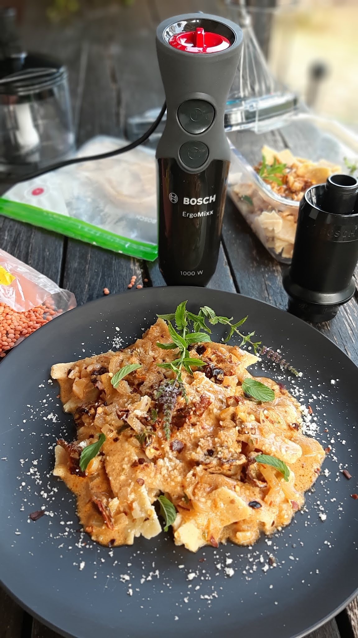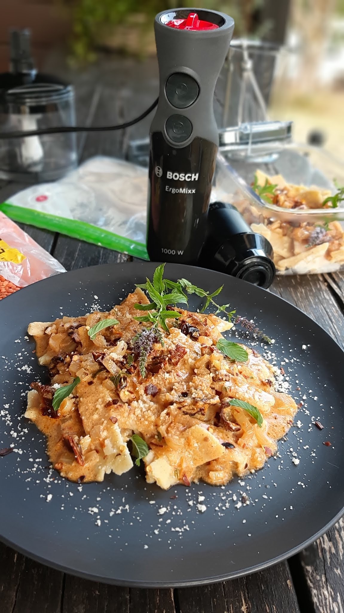 Днес ще месим с брашно от червена леща, ще направим немската широка паста Bndnudeln и после ще ги сервираме с най кремообразния и вкусен със сушени червени домати и мноого джоджен от моята немска градинка.