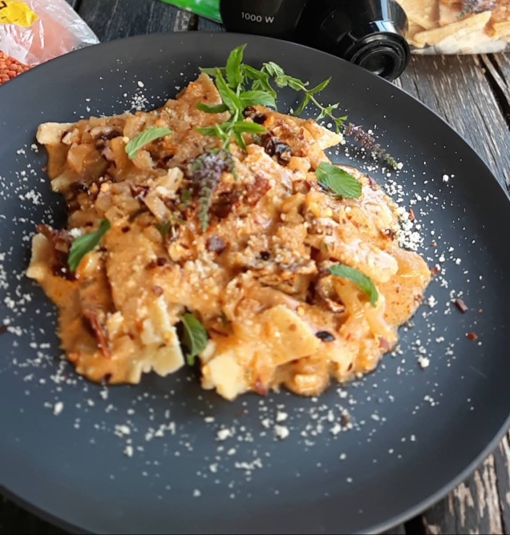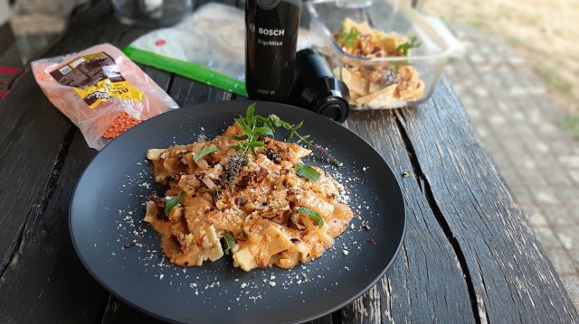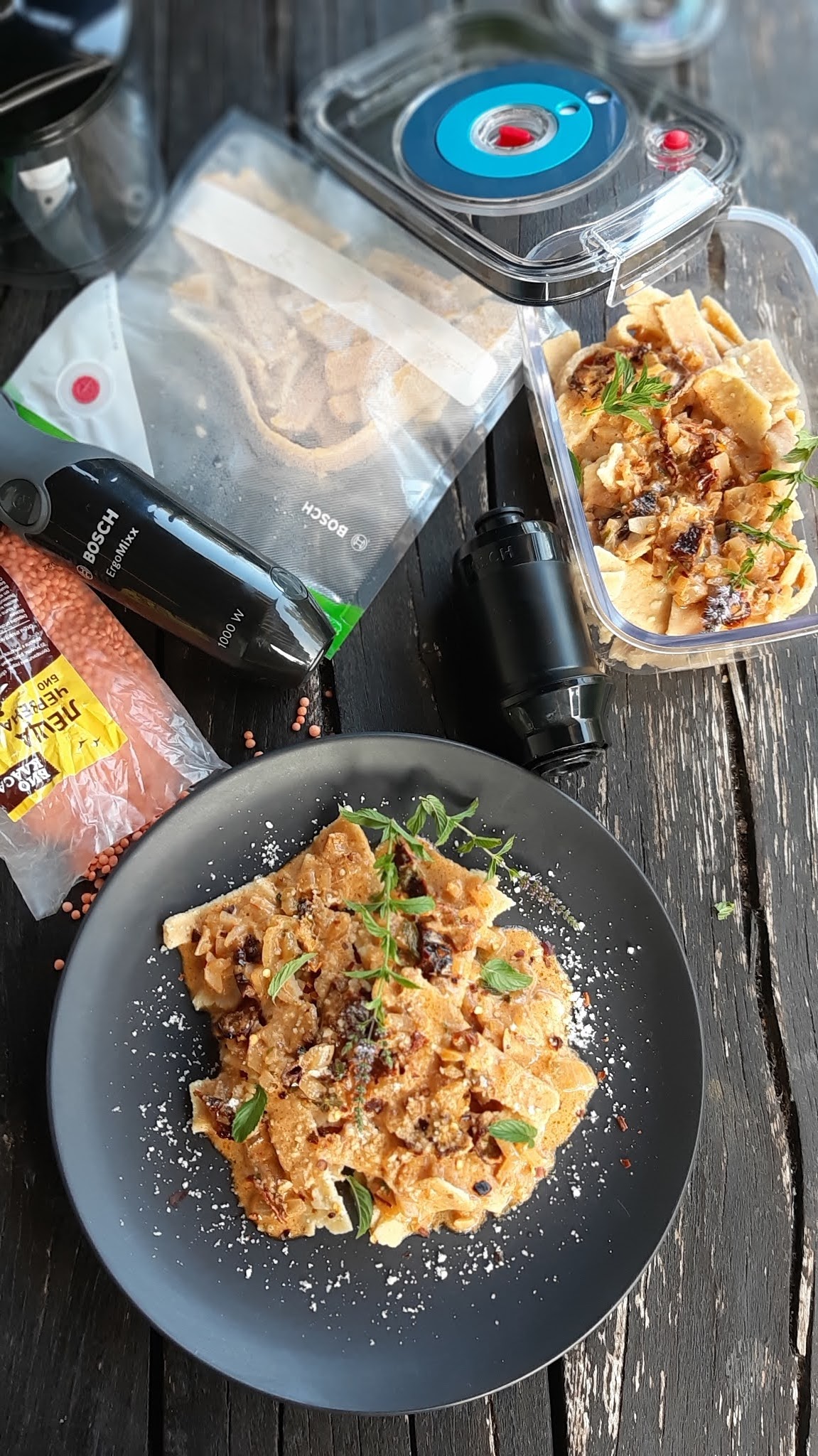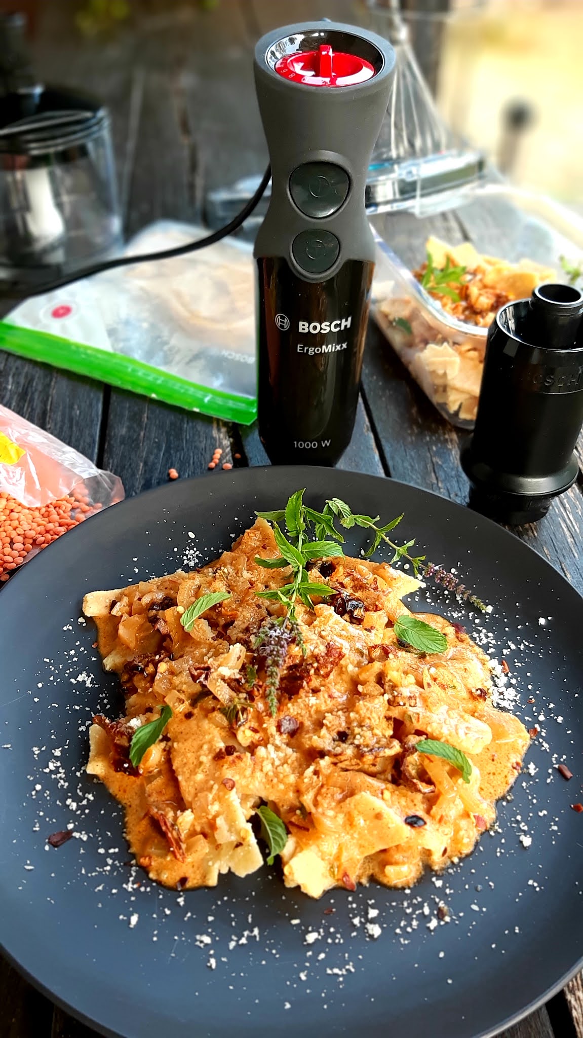Днес ще месим с брашно от червена леща, ще направим немската широка паста Bndnudeln и после ще ги сервираме с най кремообразния и вкусен със сушени червени домати и мноого джоджен от моята немска градинка.