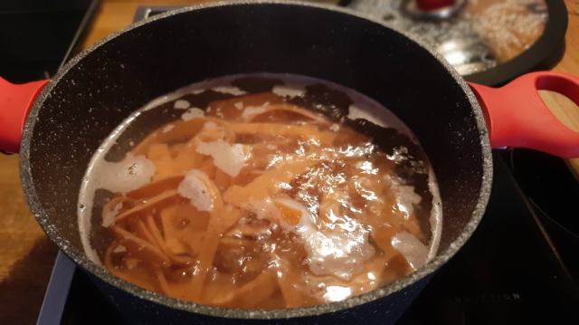 - В голяма тенджера слагам на котлона да заври достатъчно количество подсолена вода.