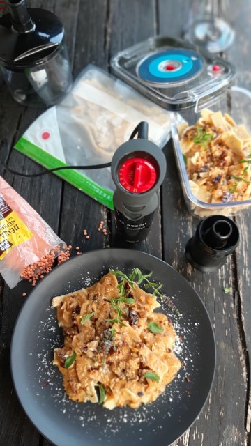 Ние сме само двамата с моя съпруг и винаги една рецепта, която е за 4 порции ни е много. Поради тази причина, част от сварената вече паста вакуумирах в специалните пликове, съпровождащи комплекта ErgoMix. С помощта на специалната вакуум помпа към пасатора, вакуумирах и така ги съхранявам от 7 до 10 дни в хладилник. Тази паста не препоръчвам да се замразява.