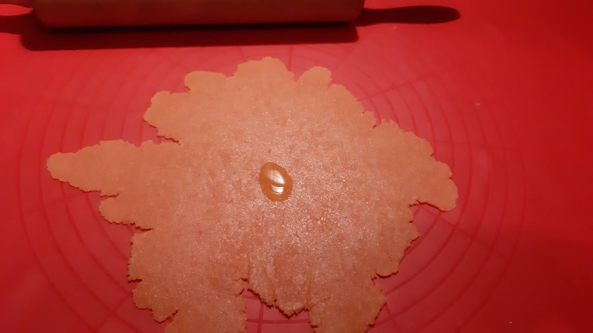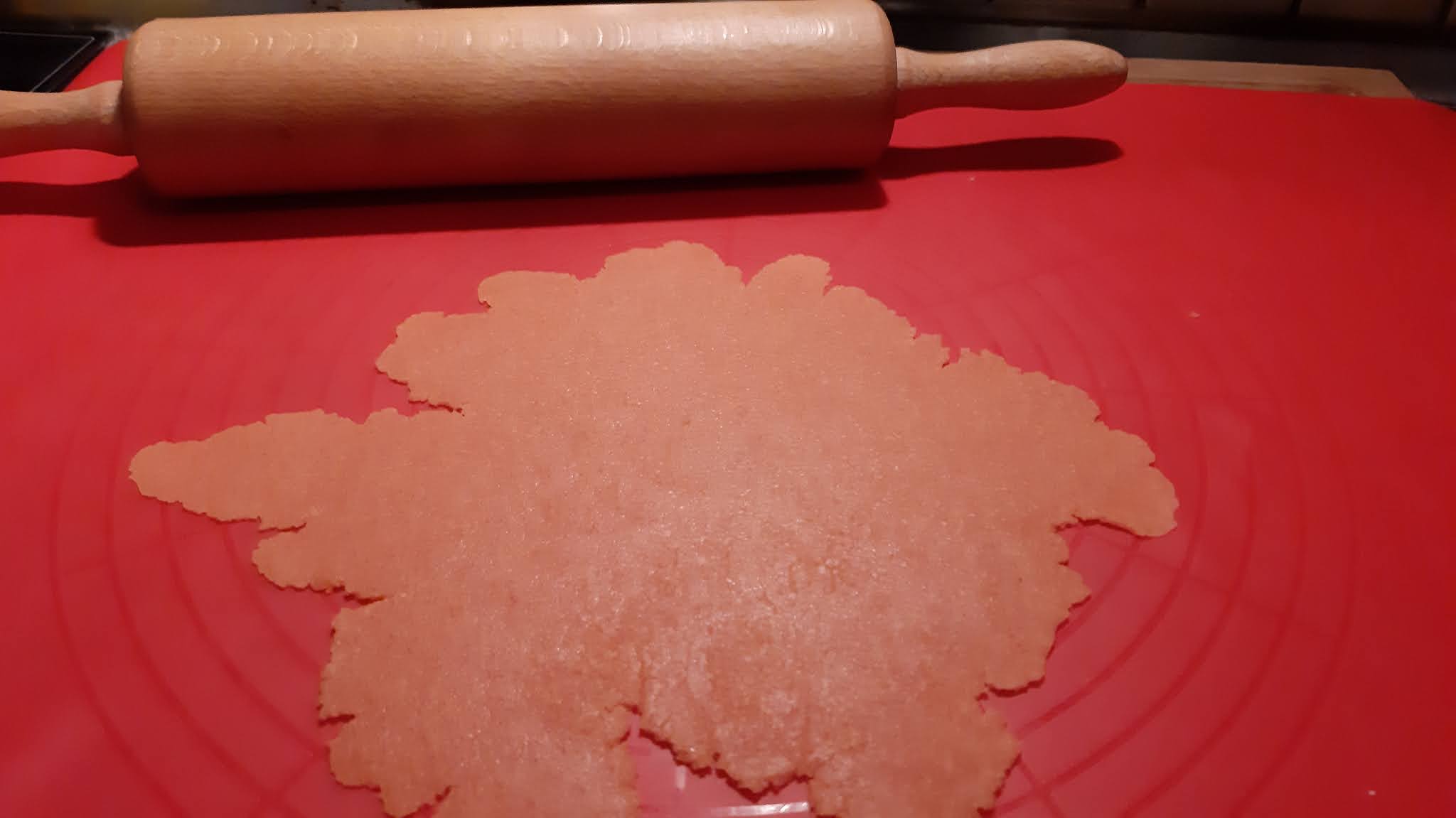 - Разделям тестото на две части и разточвам на тънка около 2 мм кора.