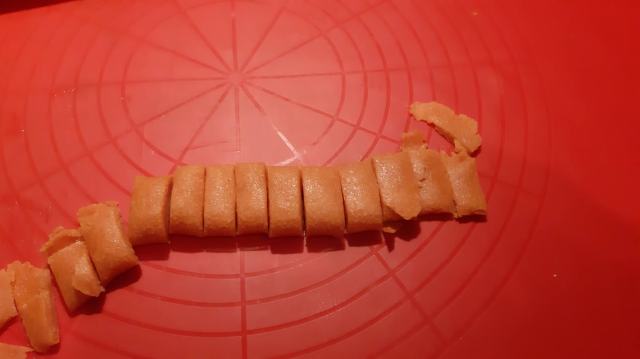 - Рулото нарязвам на парчета с дебелина около 1 см.