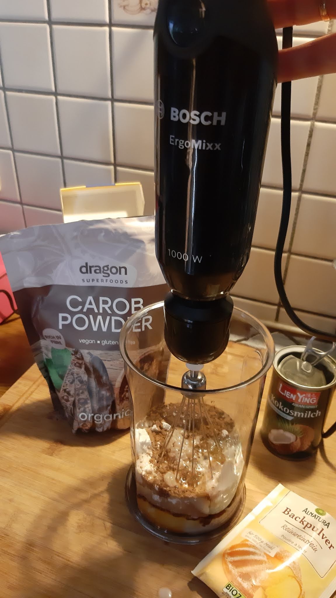- Слагам всички продукти в купата към уреда и разбивам за кратко с накрайника за миксер.