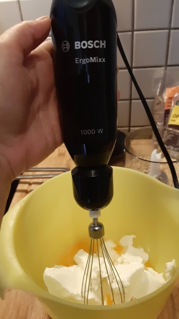 - Разбих с приставката за миксер до тесто с гъстота като за кекс.