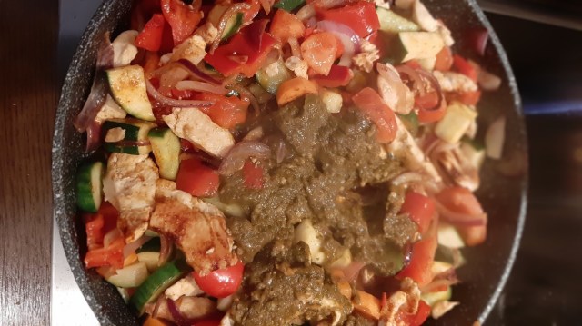 - Сега вече изсипвам зелената къри паста и разбърквам. Котлонът продължава да е на средна мощност.