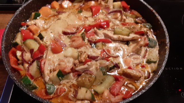 - След две минути изсипвам кокосовото мляко, разбърквам и оставям на котлона да къкри ястието около 10 минути. Котлонът ми е почти на 2 степен. А тиганът е покрит с капак.