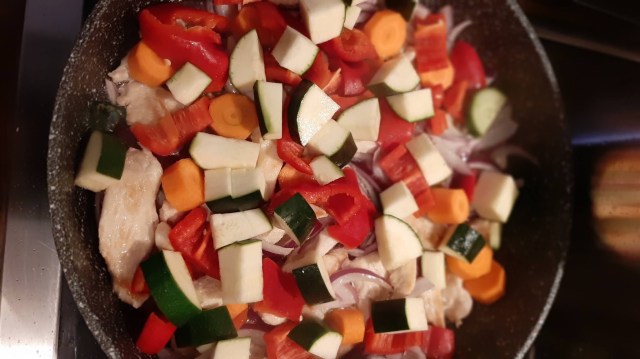 - Сега вече добавих всички останали и предварително почистени и нарязани зеленчуци.