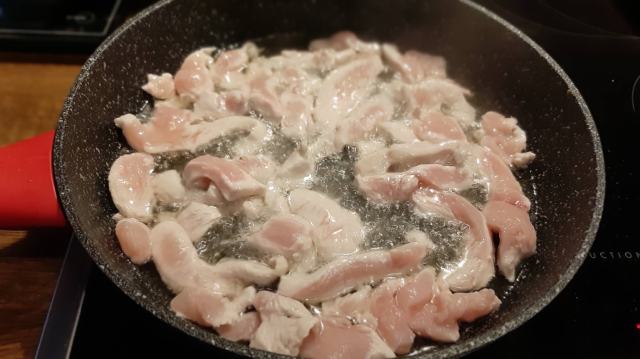 - Загрях в тигана олиото и изпържих пилешкото месо докато получи златист цвят. Котлонът е на максимална мощност, защото в противен случай пилето пуска много вода и се вари, а не се пържи.