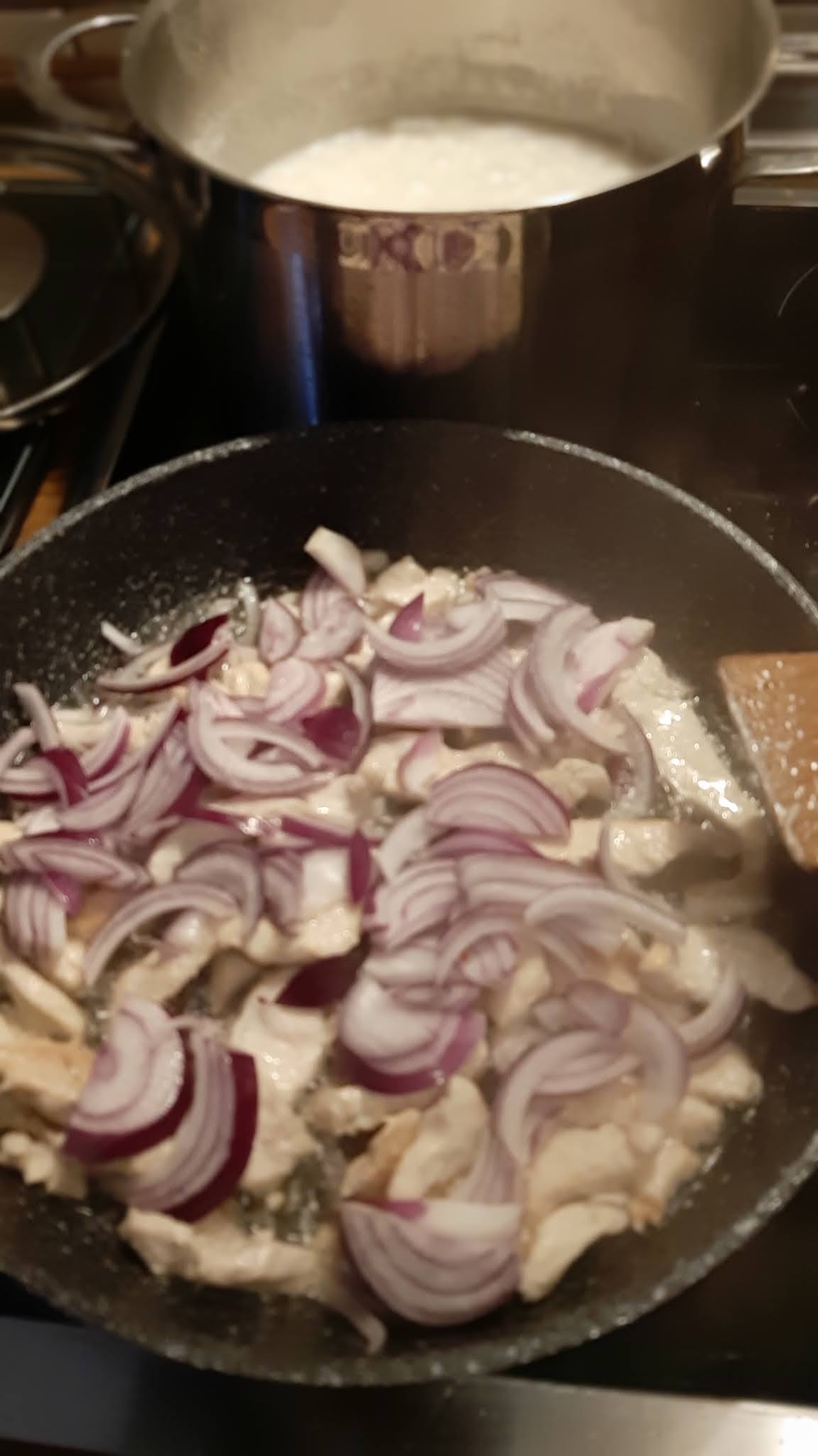 - Добавих нарязания на лентички червен лук и пържих само 2 минути на средна мощност.