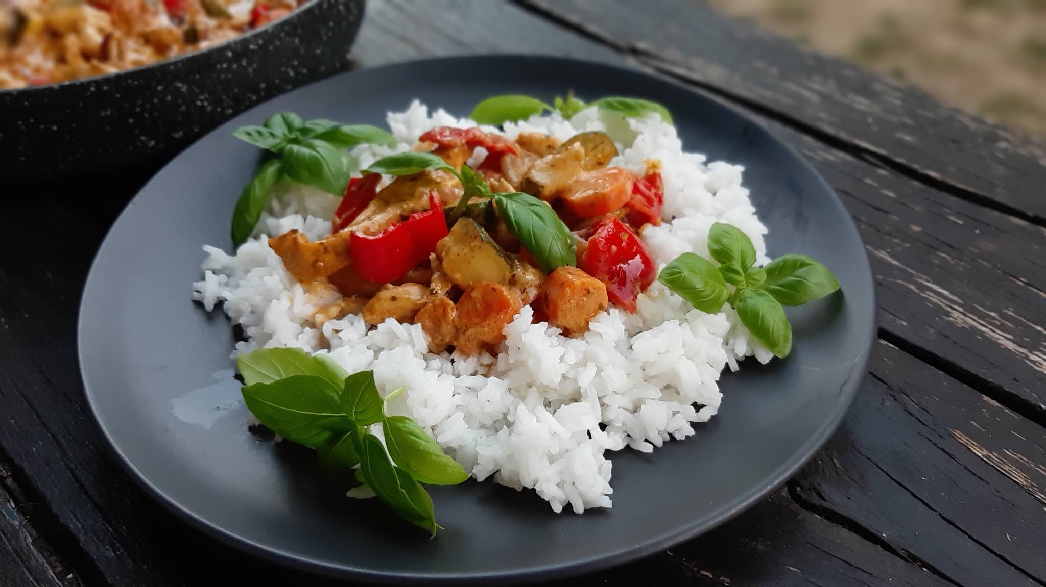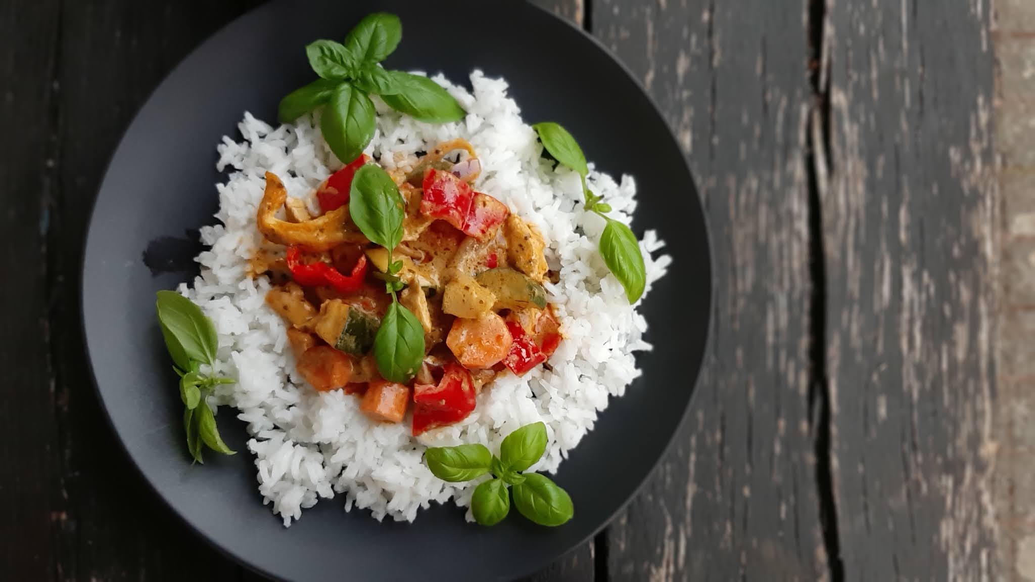 Сервирам тайландското зелено къри с ориз и поръсено с босилек.