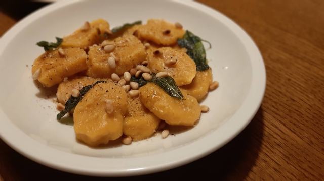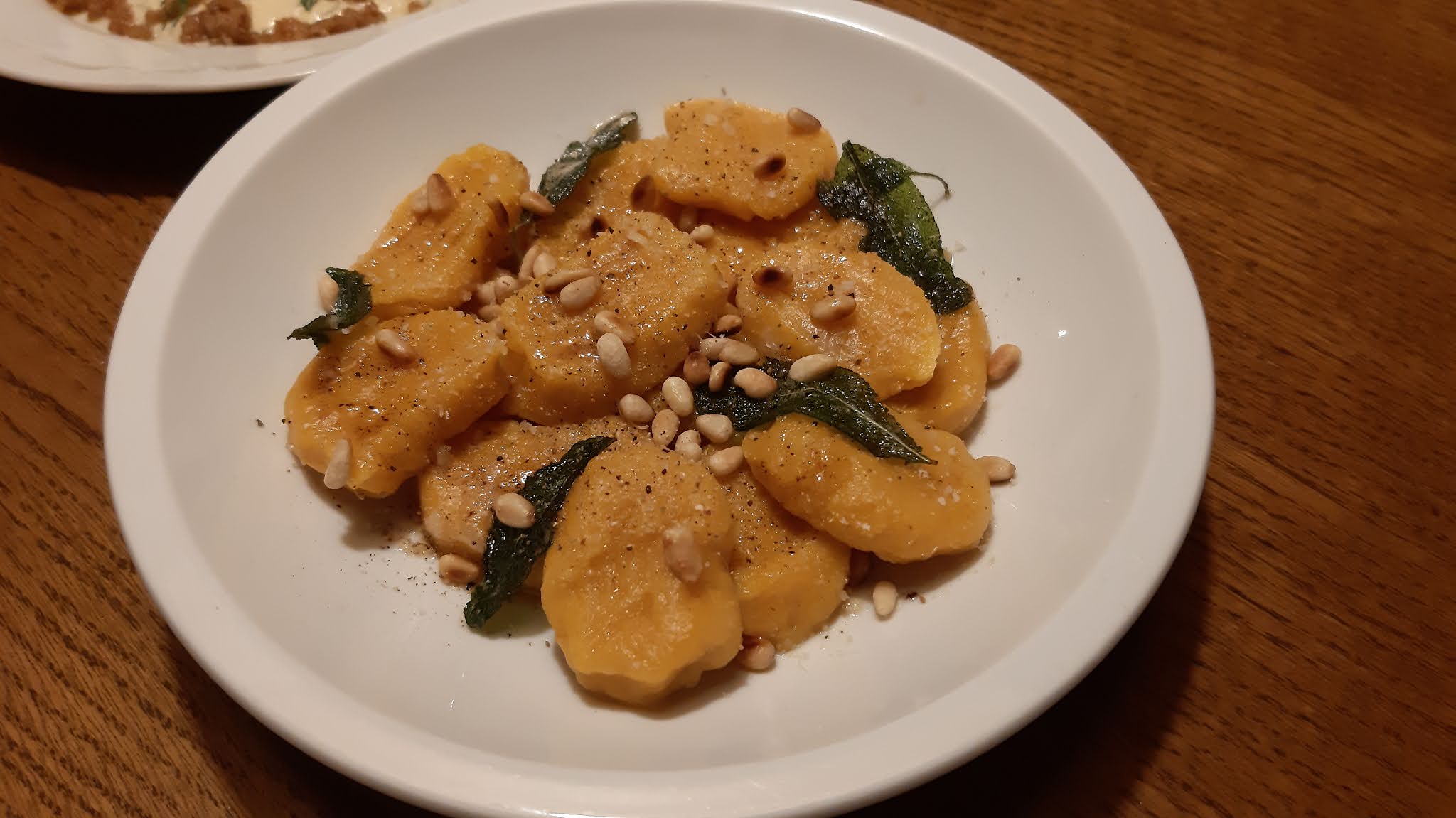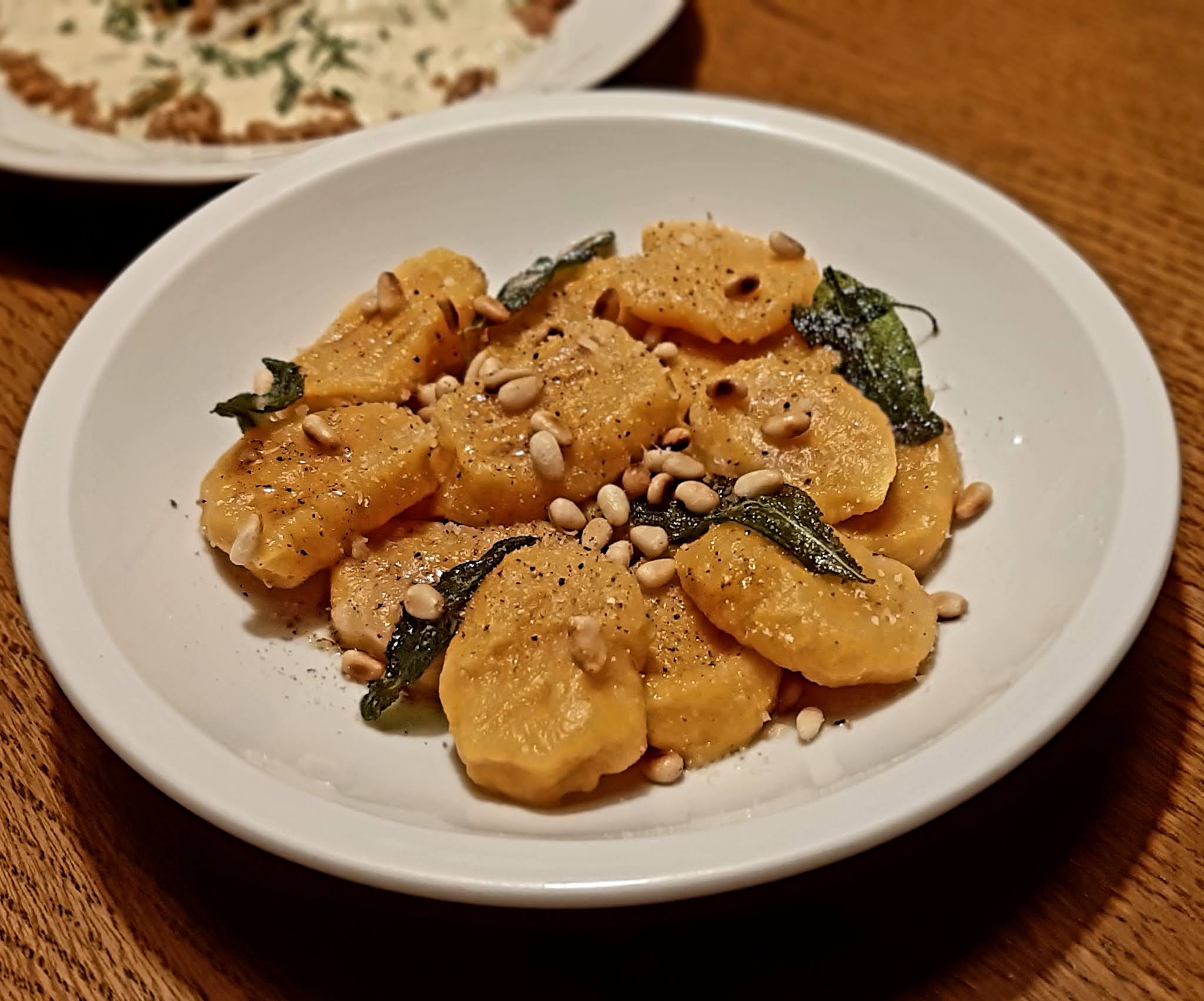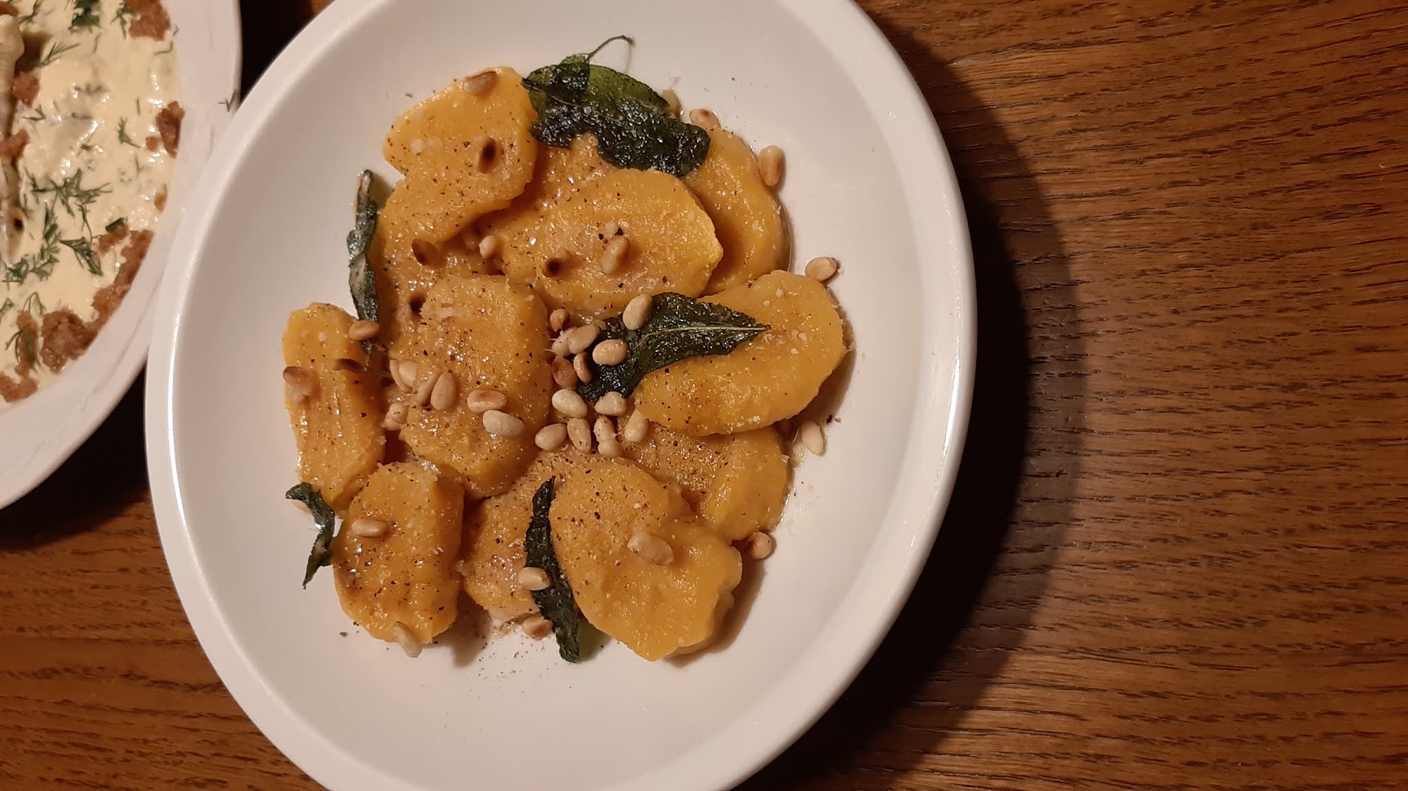 - Днешните тиквени ньоки сервирах с горещо масло със салвия и кедрови ядки.