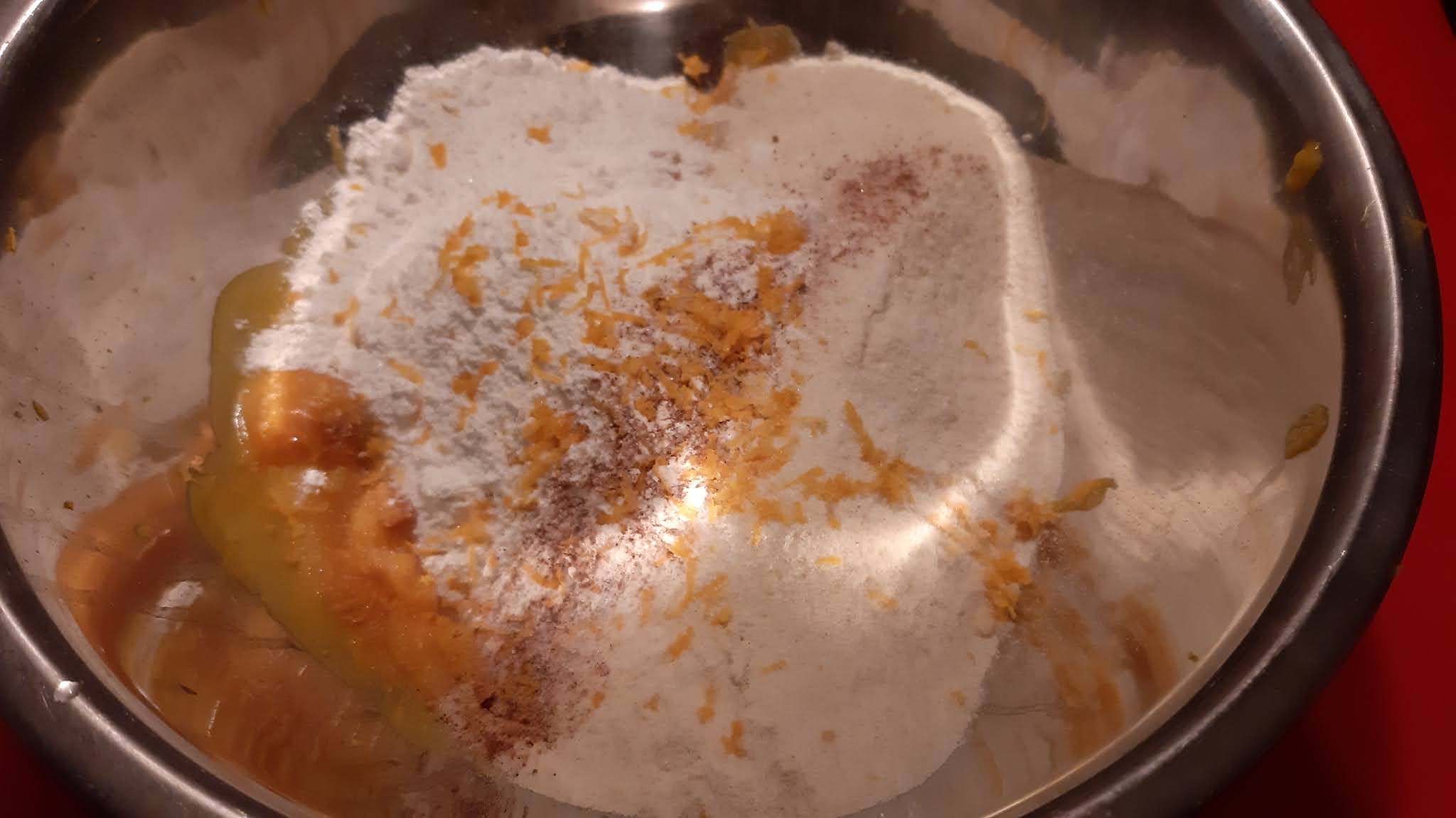 - В купа смесих пюрето от тиква, картофите, грис, брашното, сол, индийсо орехче и настърганата кора на портокала.