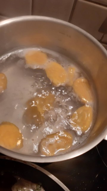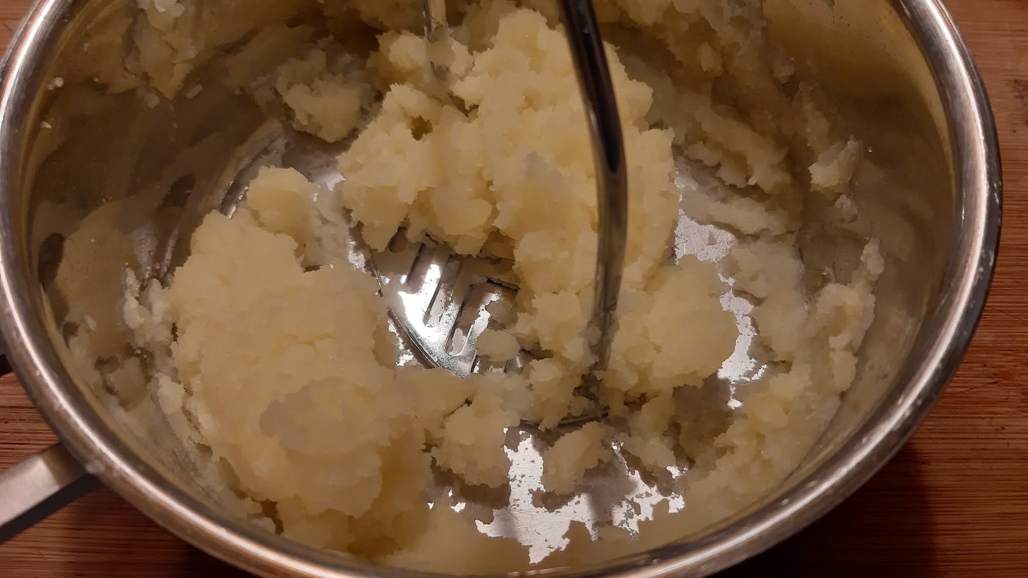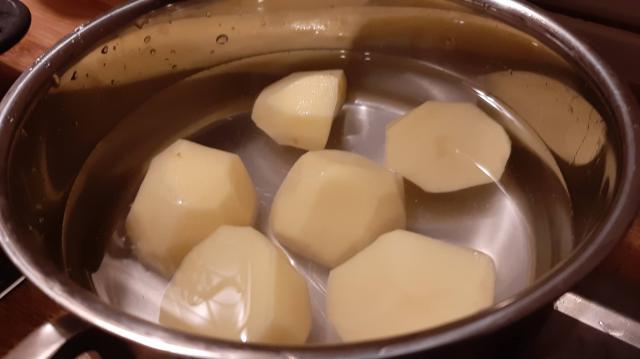 - Картофите обелих и сварих в подсолена вода за около 20 минути или до пълна готовност като за картофено пюре.
