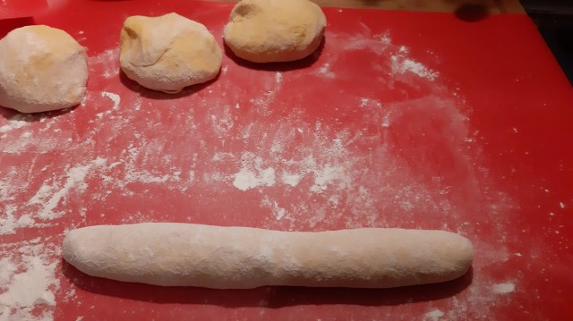 - За по лесно си разделям тестото на четири еднакви части, които оформям на рулца с дебелина 3 см.