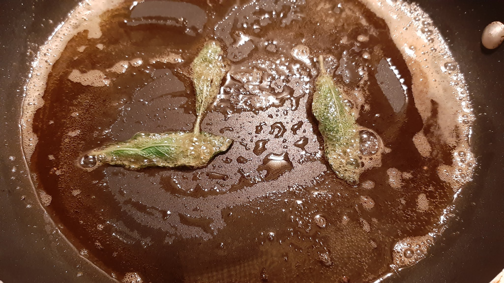 - За целта загрях маслото до покафеняване и пуснах за кратко листата салвия, които много бързо станаха хрупкави.