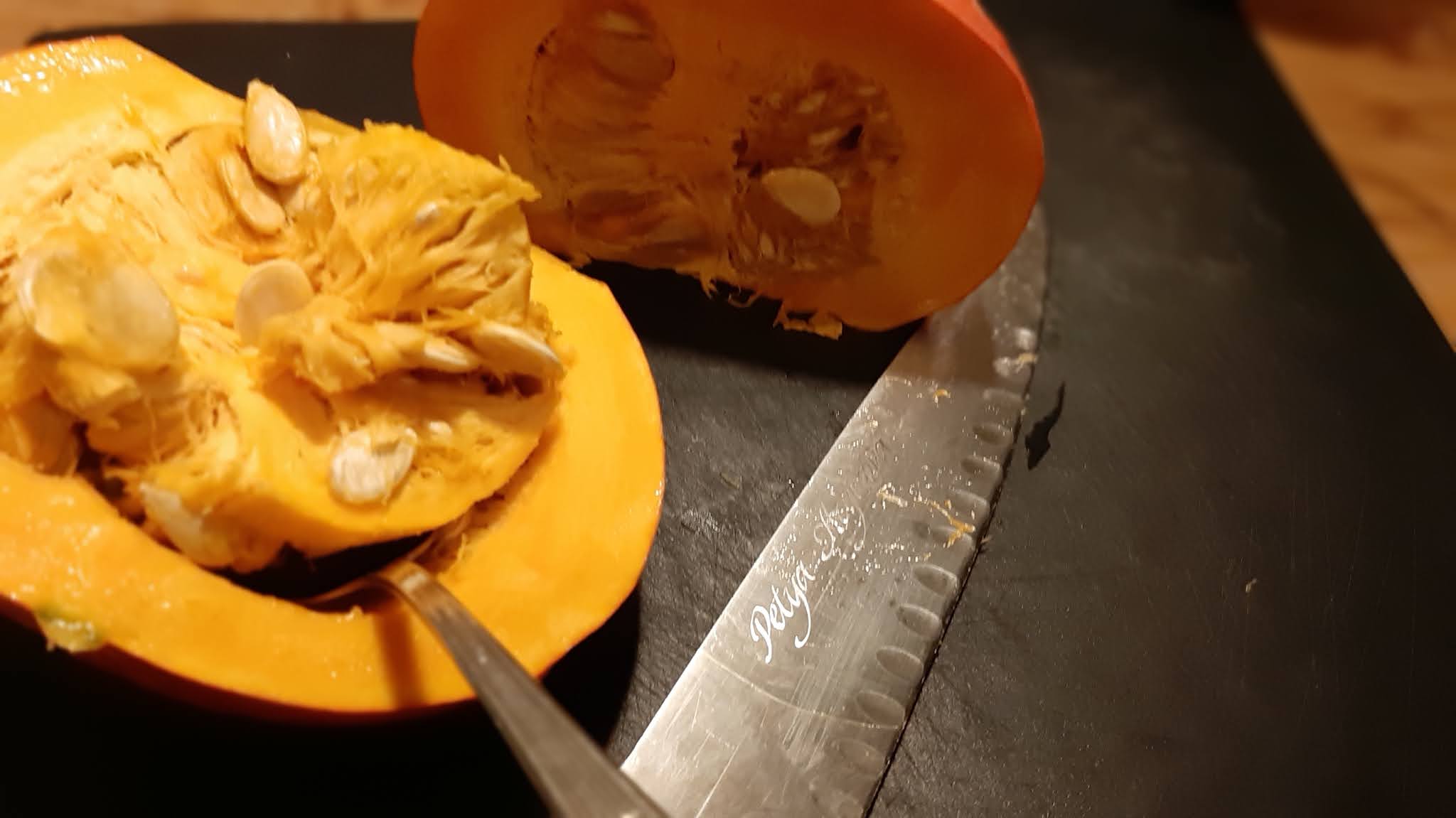 - Измивам тиквата, режа на половина и с лъжица издълбавам семките.
