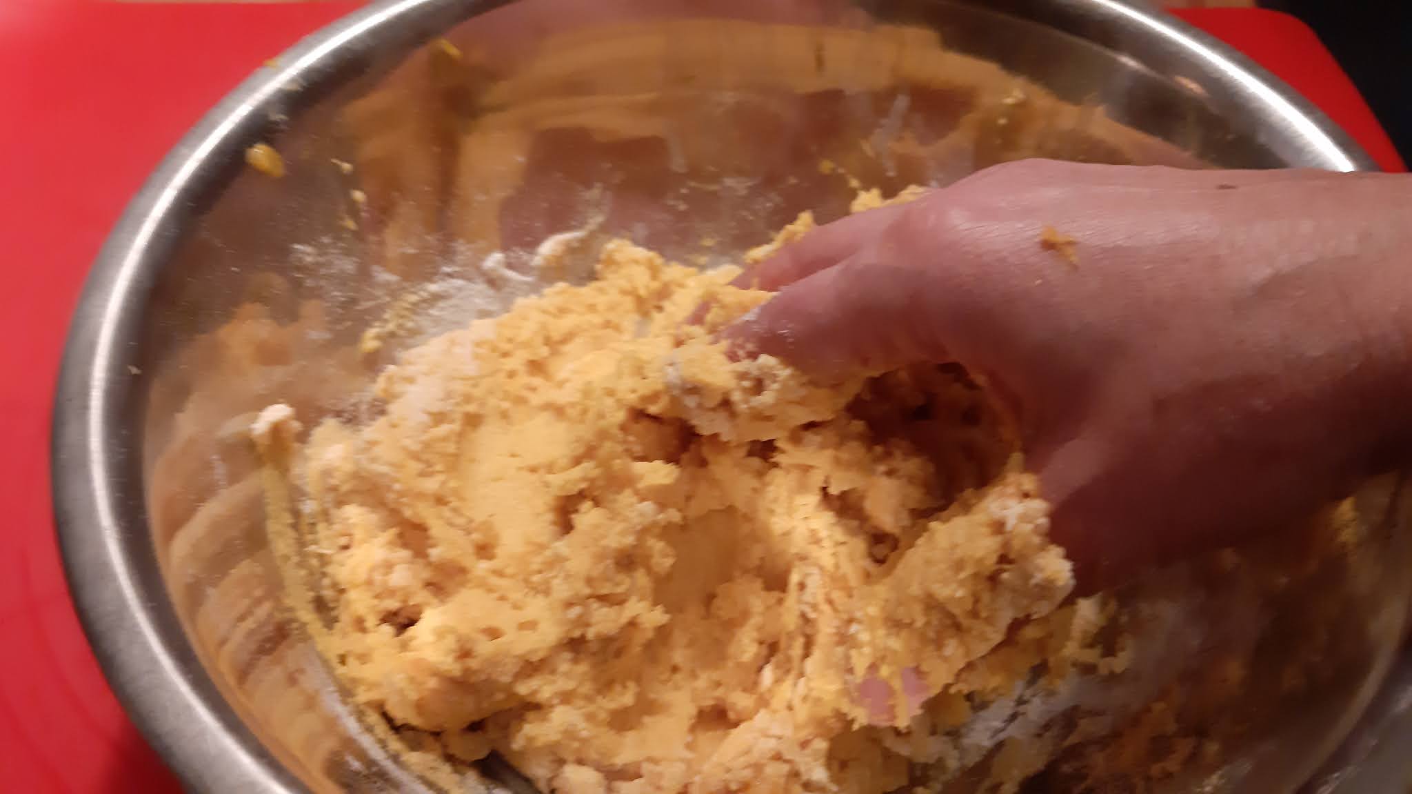 - Омесих на ръка, като на мен ми се наложи да добавям брашно. Всичко зависи от това колко мека част от тиква и колко от картофи сте получили, защото при всеки може да е различно количеството. Все пак отмерваме сурови продукти и преди да са обелени. Нужно е да получим хубаво и нелепнещо тесто. Нито много меко, нито много твърдо.