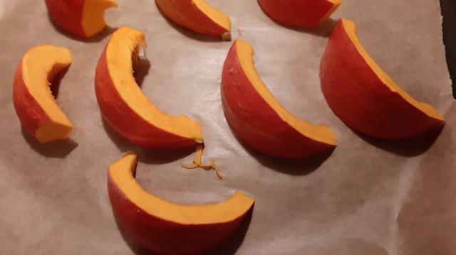 - Тази тиква е с мека кора и се реже лесно. Режа резенни, които обръщам с кората на гора и подреждам в тава с хартия за печене.