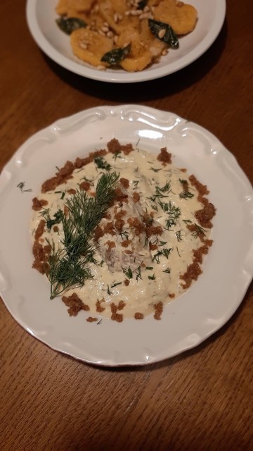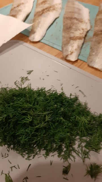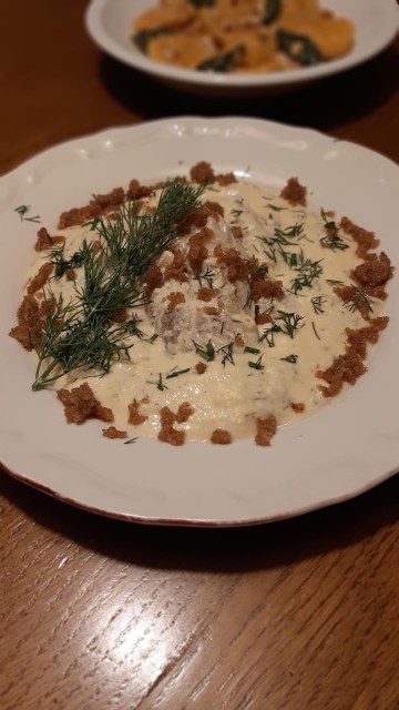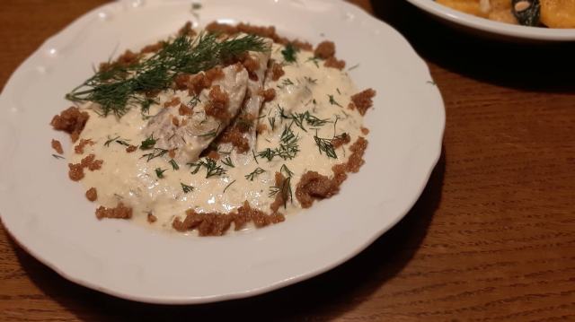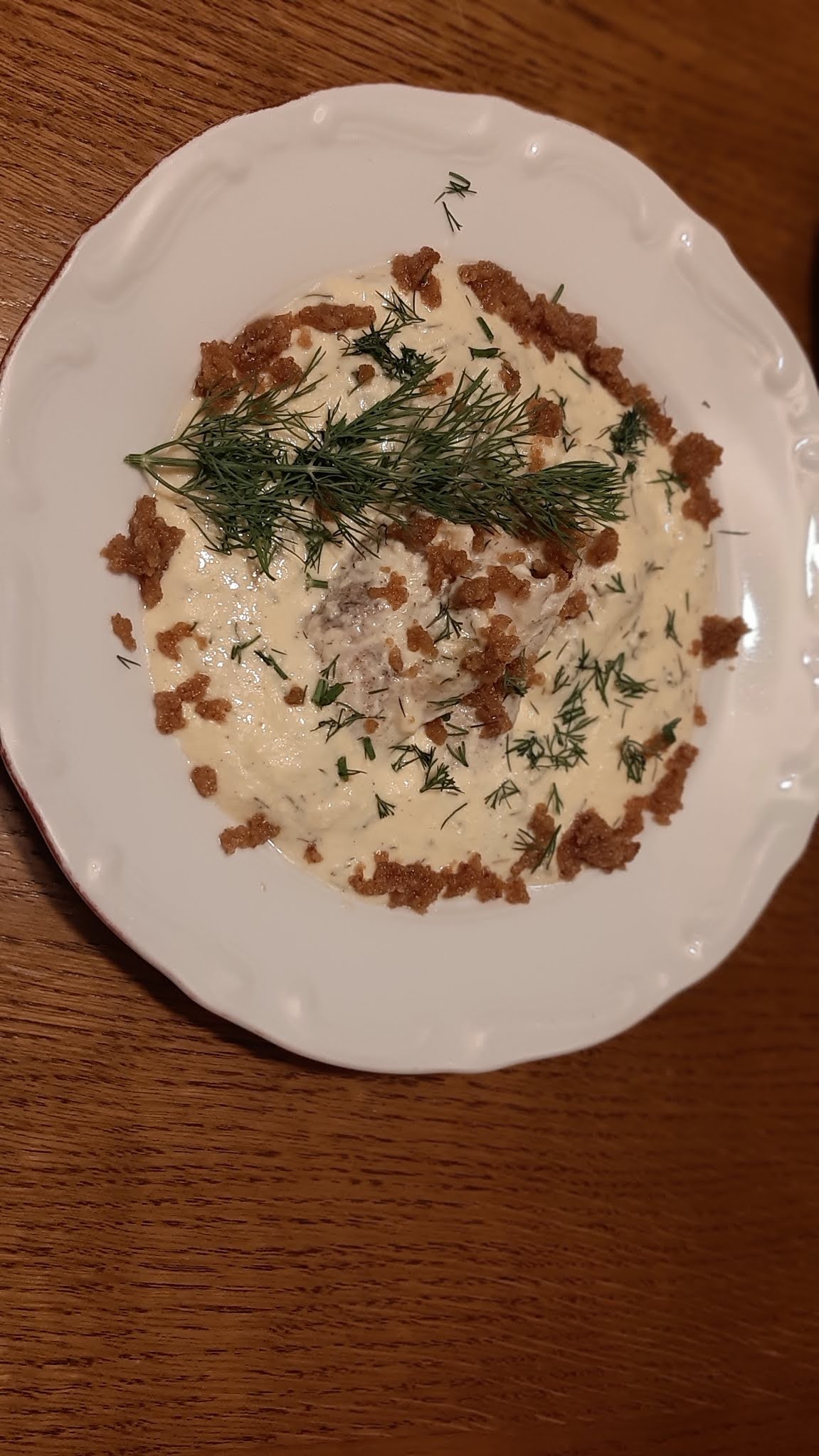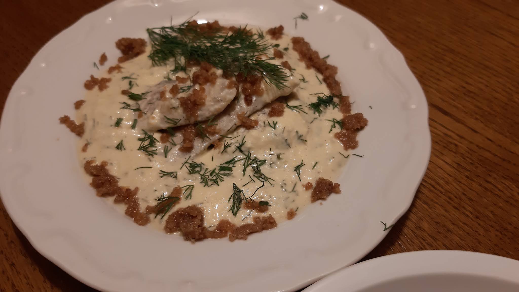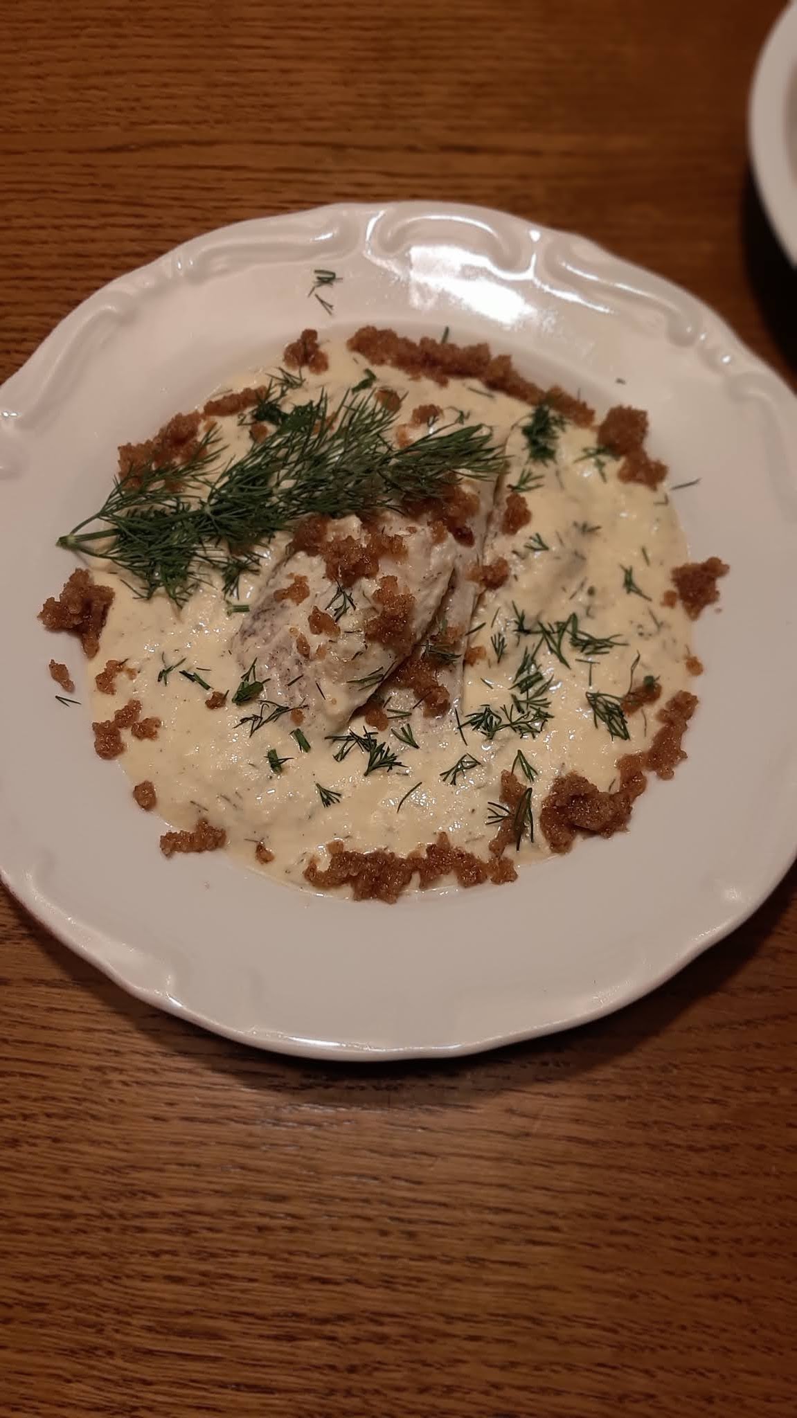 - Сервирам рибните филета в топла чиния, заляти със сметановия сос и поръсени обилно с хрупкава галета и копър.
