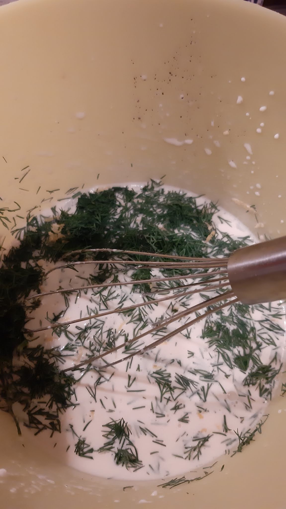 - В купа смесвам сметаната и жълтъците. Добавям хряна.