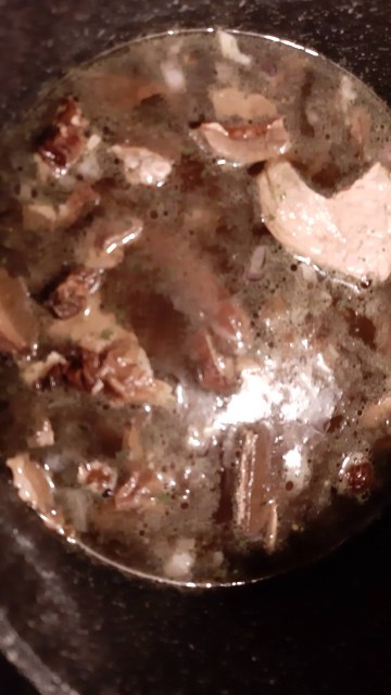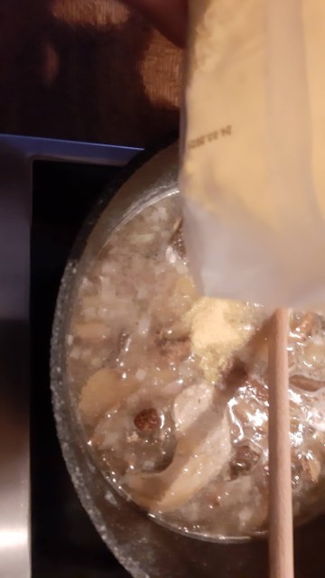 - Залях омекналия лук с манатарките и водата от тяхното накисване, като я отмерих. Добавих и зеленчуковия бульон. Нужна ни е 1 л . течност. Това е важно, защото в противен случай има опасност да получите нещо между полента и качамак или още по-зле, нещо много гъсто. А тази полента трябва да е рядка. Трябва да е сочна, да не се налага с нож да я режете, а по-скоро с лъжица да си я похапвате.