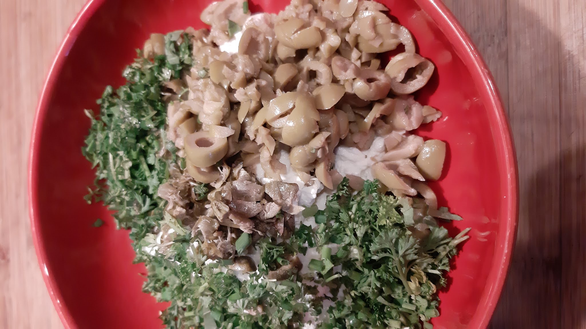 - След това приготвих рикотата. За целта в купа я изсипах и добавих нарязаните на ситно каперси, маслилни и зелени подправки. От подправките оставих малко за декорация.
