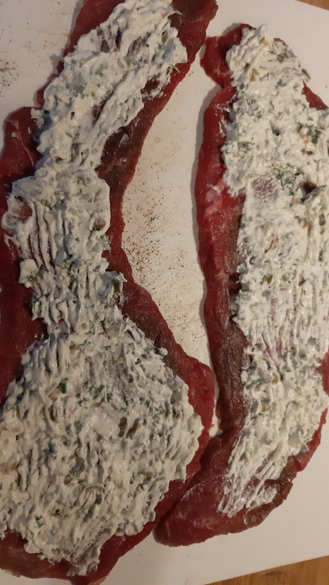- Овкусих обилно със сол и черен пипер и после намазах с подправената рикота. Стараех се да оставя краищата на месото свободни от рикота, за да мога да навия на рулца после.