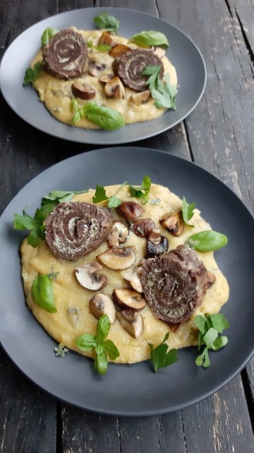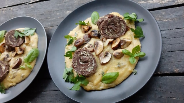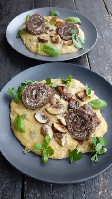 - Сервирам ястието в затоплени чинии. Първо полента, а върху нея от печурките и най-отгоре отрязани на половина руладини, за да им се види красотата от вътре. Сосът сервирам отделно. Той се добавя по желание. И без него ястието е много вкусно.
